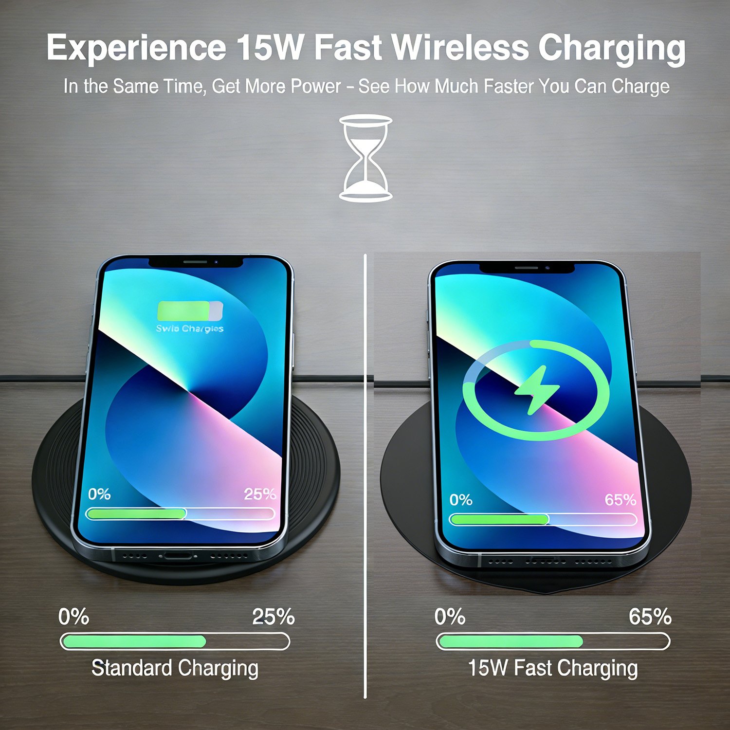Get a serious speed boost. With 15W fast charging, your phone powers up in less time—intelligently optimized for both iPhone and Android. Charge quickly, not loudly.