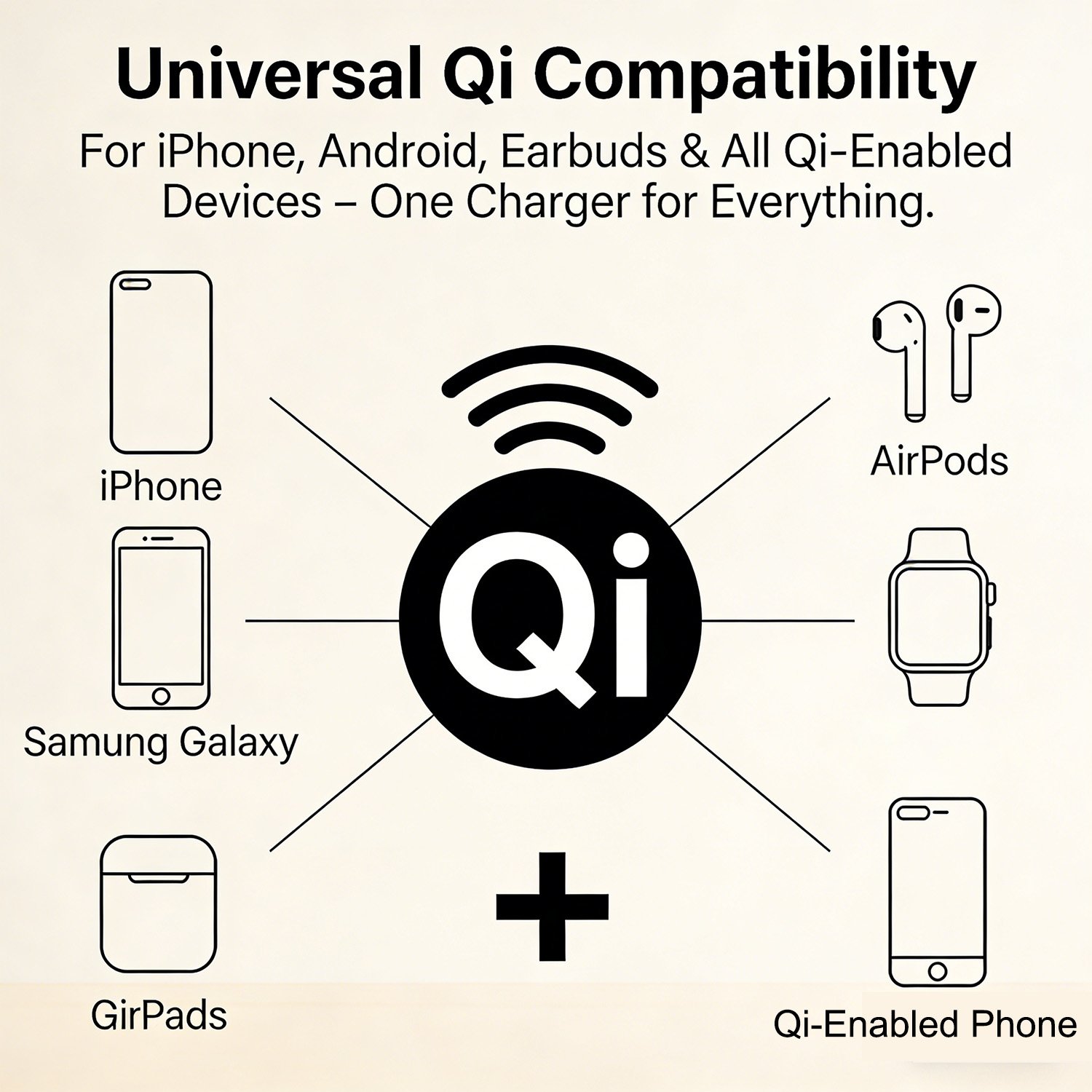 Works with all Qi-enabled phones including latest iPhone and Andorid models, as well as wireless earbuds like AirPods. A versatile solution for all your devices.